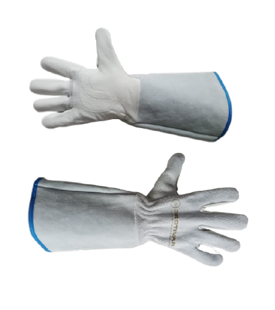 Luva de segurança confeccionada com couro bovino tipo vaqueta na palma e couro bovino tipo raspa no dorso, com reforço interno na palma, elástico no dorso, com fita de reforço costurada no punho. Comprimento do punho 20 cm