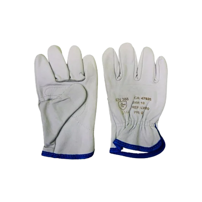Luva de segurança confeccionada com couro bovino tipo vaqueta na palma e couro bovino tipo raspa no dorso, com reforço interno na palma, elástico no dorso, com fita de reforço costurada no punho.